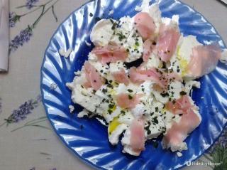 Tomini con olio, prezzemolo e fettine di prosciutto