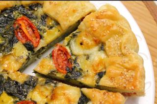 Torta salata con spinaci, patate, pomodorini e Asiago