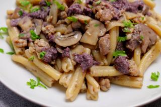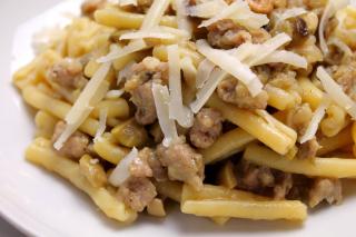 Casarecce con crema di radicchio, salsiccia e funghi