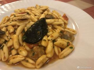 Cavatelli con pomodori pachino, gamberetti e granella di nocciole