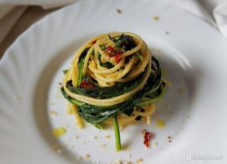 Spaghetti con cicoria, acciughe, pangrattato e peperoncino