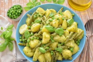 Insalata di patate con pesto, fagiolini e piselli