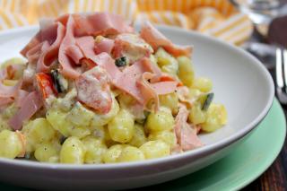 Gli gnocchetti di patate con zucchine, pomodorini, Philadelphia e mortadella sono un primo piatto ricco di sapore e cremoso, perfetto da gustare durante un pranzo in famiglia.