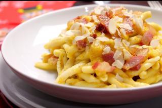 Casarecce con crema di peperoni, ricotta fresca e guanciale