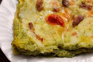 Lasagne con crema di zucchine, guanciale, Asiago e pomodorini