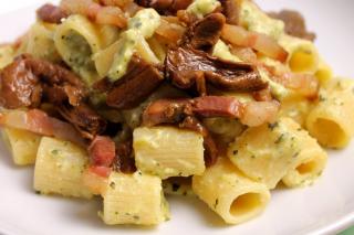 Mezze maniche con crema di zucchine, funghi porcini e guanciale