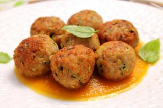 Polpette di maiale e zucchine su salsa di datterino giallo