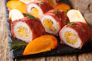 Rotolini di maiale avvolti nel prosciutto, farciti con cachi e caprino