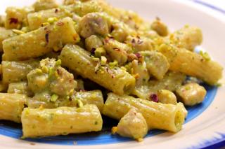 Rigatoni con crema di zucchine, pistacchi e pesce spada