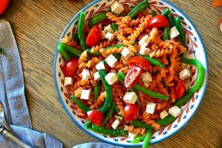 Fusilli di lenticchie con fagiolini, pomodori e tofu