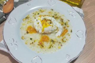 Uovo poché su crema di fagioli, sedano rapa e crumble di pane