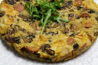 Tortilla di patate, cipolle, wurstel ed Emmenthal