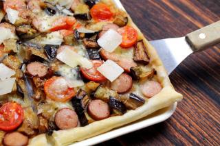 Pizza di sfoglia con melanzane, wurstel, pomodorini e mozzarella