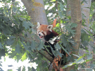 Un cucciolo di panda si nasconde dietro l'uomo. Quando si gira tutti scoppiano a ridere
