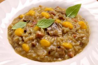 Risotto con funghi porcini secchi, pancetta e crema di zucca