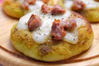 Focaccine con pesto di basilico, salsiccia e mozzarella