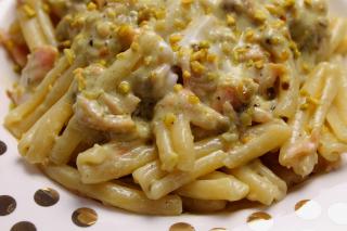 Mezzi rigatoni con zucca, pancetta, stracchino e gorgonzola