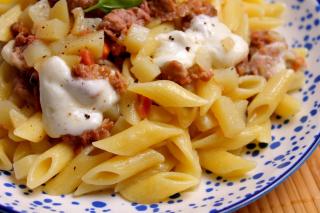 Le mezze penne rigate con salsiccia, patate e stracchino sono un primo piatto ricco e saporito, perfetto da gustare durante un pranzo in famiglia e da accompagnare con un calice di vino rosso.