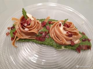 Farfalle con crema di zucchine, basilico e bresaola