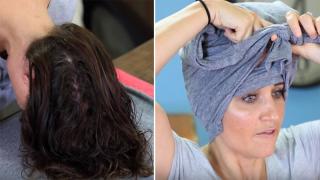 Avvolge i suoi capelli umidi in una maglietta. La mattina dopo sfoggia un look straordinario!